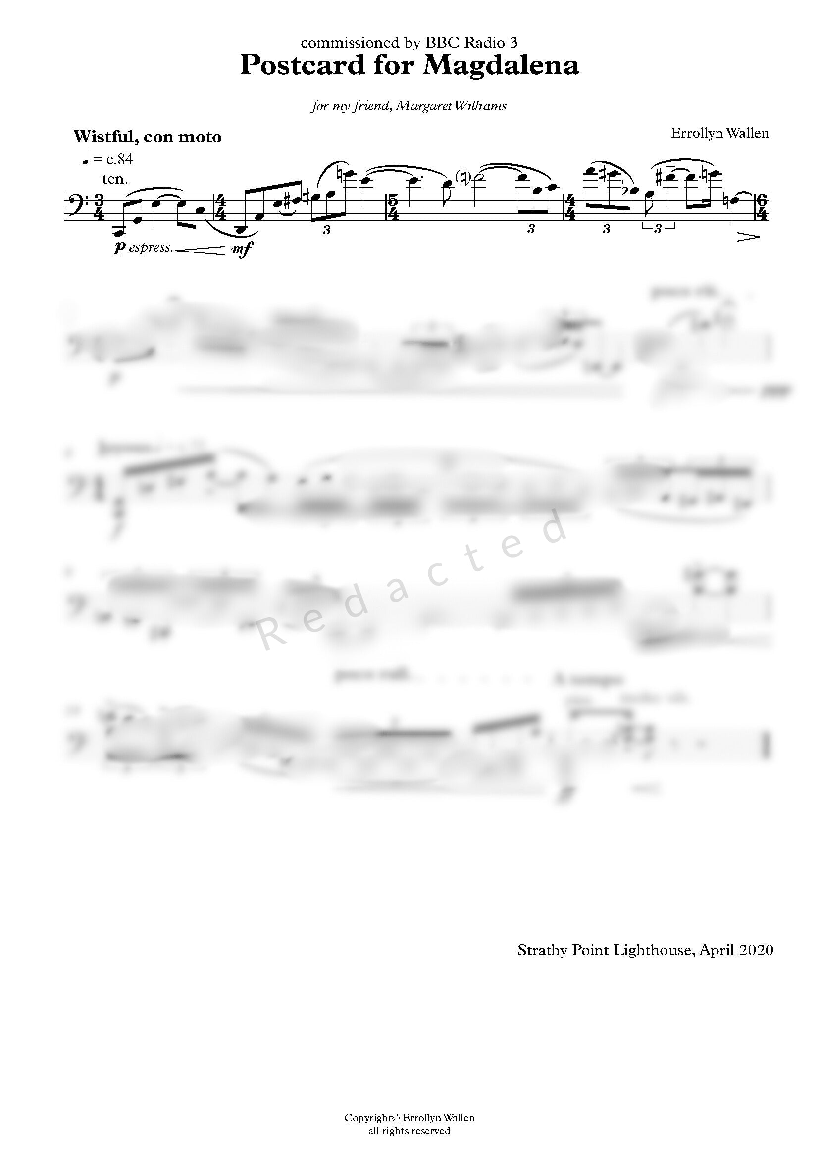 Commissioned by BBC Radio 3 and for my friend, Margaret Williams.